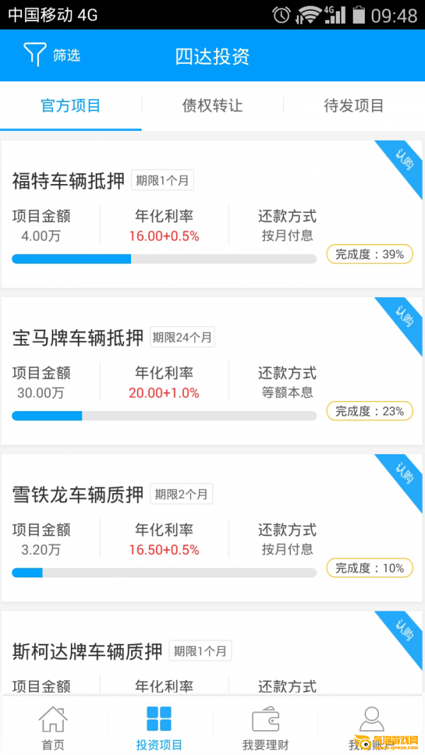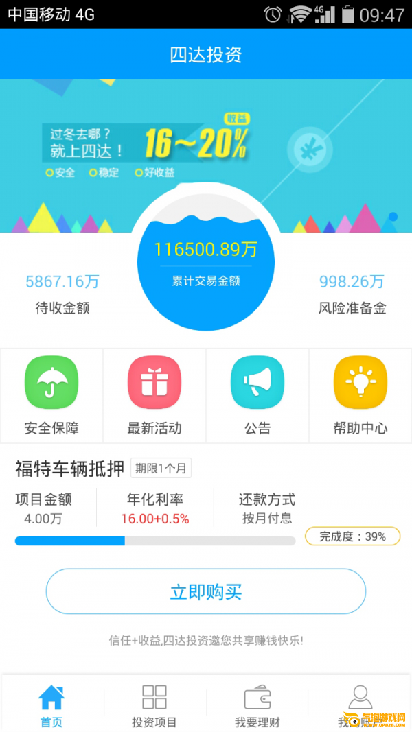 四达投资新版安卓版APP,是宜宾四达投资有限责任公司(简称四达投资)最新开发的手机端理财产品,四达投资稳定、安全的P2P网络借贷平台,50元起投,16%―20%年化收益,1-24月,所有项目均100%保本保息。手机用户下载“四达投资”新版安卓APP,便可以随时随地投资,同时还能享受更多的平台优惠活动,让理财变得更简单。