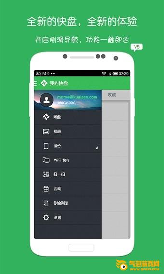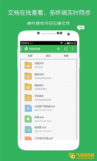 快盘Android版本主打手机数据全备份,支持照片、通讯录、通话记录、联系人、短信、微信等文件和数据备份,可以手动添加需要备份的文件夹,支持手机数据的在线管理、同步。