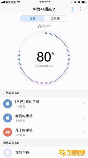 在APP管理的首页中,我们可以看到流量使用情况、电池电量以及正在连接的设备。点击某一个连接设备后可以进行设备上网权限的管控,可以一键拉黑不信任的设备。