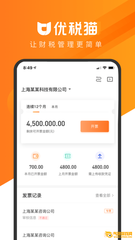 优税猫APP是一款非常强大的手机企业管理软件。优秀的税猫app有很多企业管理功能,极大的方便了员工的工作,极大的节约了企业管理的成本,并且具有企业审计、企业缴费、纳税凭证、开票、信息改进等功能,非常方便。优秀的税猫app为企业提供了更加便捷的管理功能,使财税管理更加简单。