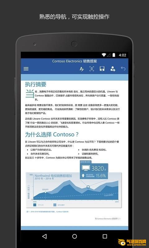 -用Word创建漂亮的文档轻而易举。文本框、图表或图片可以通过简单的指尖操作插入。
