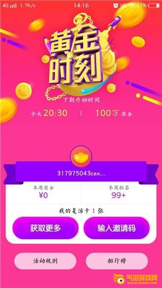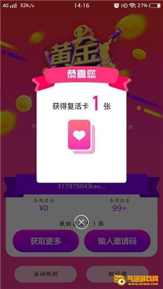 分享到微博/微信/qq*生成邀请码=好友黄金时间下载登录-输入邀请码,两人都获得复活卡=每天获得次数不限。