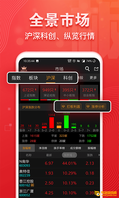 2.进入市场界面后,可以了解最新的市场、排名、板块、基金、股指等信息。