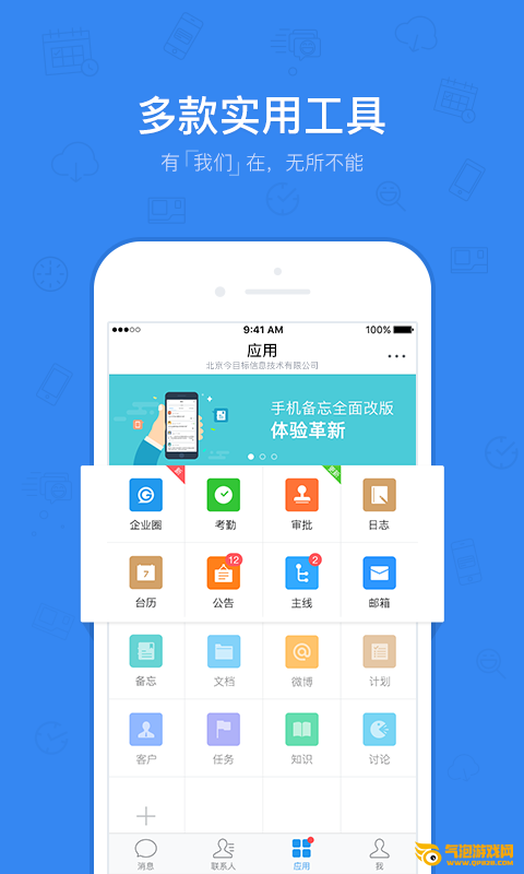 8)支持日志、客户、考勤、主线、公告、备忘录、审批、邮件、计划、任务、微博、文档、项目等各种应用。