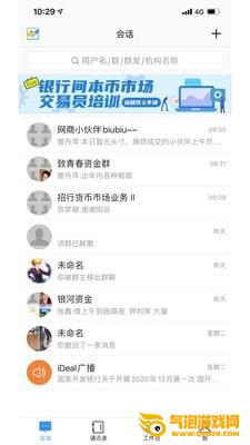 - iDeal app主要功能包括‘会话’、‘通讯录’和‘我’三个模块,用户成功登录聊天工具移动端,默认展示会话列表,‘会话’列表可查看全部消息会话,可创建群和添加好友;