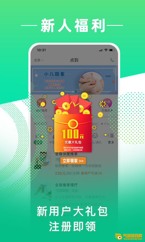 点到,专业中医,上门服务。下载app新用户首次绑定手机号码即送超百元红包,首次预约最低38元。选择服务项目、上门时间及地址,技师就会准时上门为您提供专业正规的按摩理疗服务。我们的优势在于: