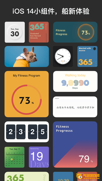 -我们为你准备了多种丰富的小组件供你选择,包括时间、照片、纪念日、每日步数、时间进度、日历、文字等更多小组件,