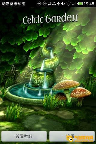神秘花园动态壁纸(Celtic Garden HD)1.6 安卓版神秘的花园里,泉水潺潺,蝴蝶飞过,非常精致的一款壁纸,背景图像、泉水、树叶外形都可以自定义,夜晚的时候,蝴蝶还会发出荧光哟!首次打开动态壁纸方式:menu键(或长按屏幕)->壁纸->动态壁纸->选择相应壁纸->设置壁纸。