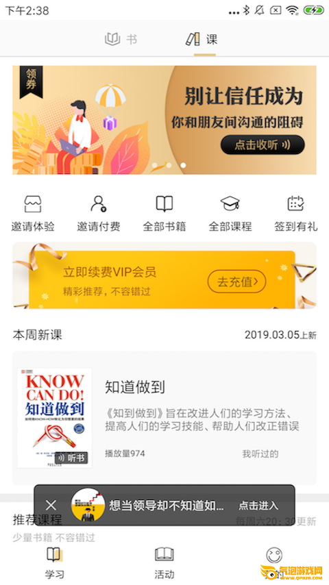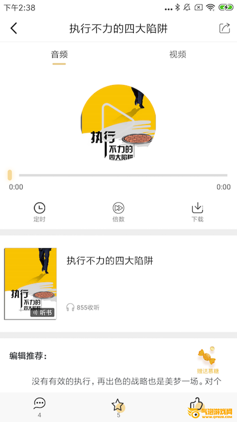 一款全新的视频听书软件,分为书、课和体验三个部分,由专业老师进行书籍精华总结和讲解,帮你利用碎片时间提升自己。还会定期举办线下讲座,方便书友们聚会交流。
