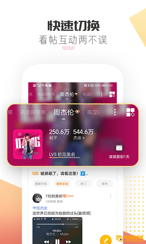 4、常用超话快速切换:有那么几个真爱超话,就把它们设为常用。可横滑切换,挨个儿签到更顺滑,看帖时来消息也不会被打断,不是我吹,真的好用!