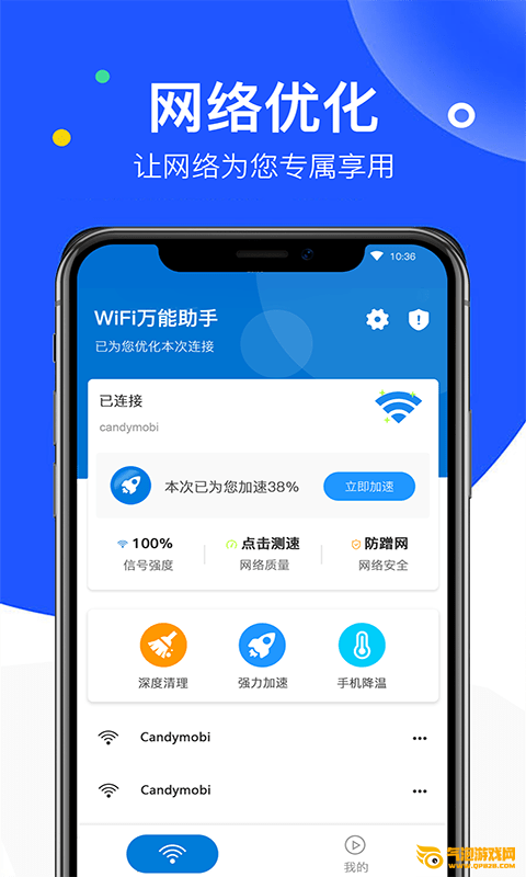 【安全管理】 全面保护上网环境,热点安全检测,保护信息安全;网速测试,信号检测。