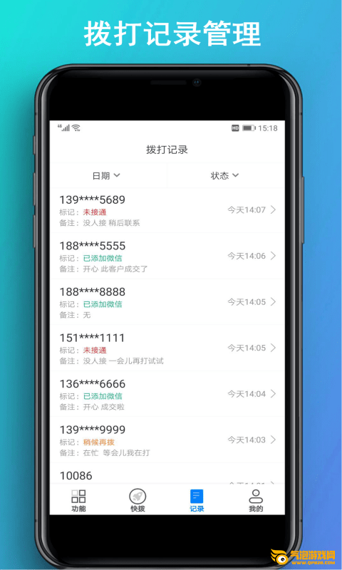 拨打记录管理:拨打完毕可设置标记和状态,方便管理。支持拨打记录导出EXCEL。