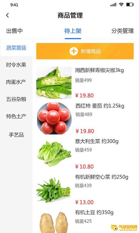 1、拥有多种商品管理栏目,这里面划分了出售中、待上架和分类管理三个栏目;