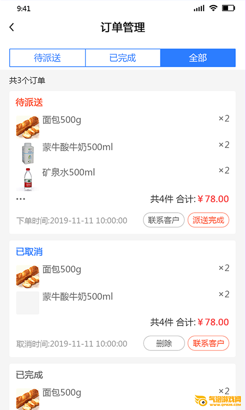 4、便捷的订单处理工具标签,不同订单上拥有对应工具,比如派送完成和删除等。