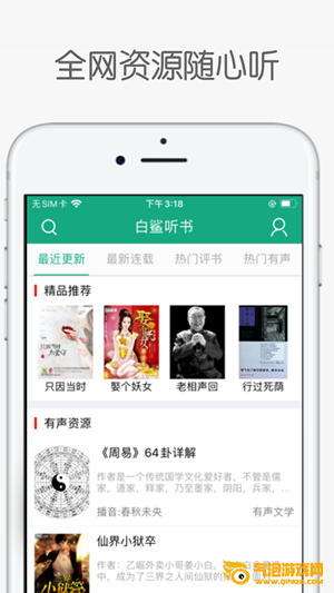 安卓版的白鲨听音app是一款免费追书的音频小说软件。白鲨听歌app提供各种流行的小说资源和漫画对白书的音频内容,可以高质量的放眼追书。