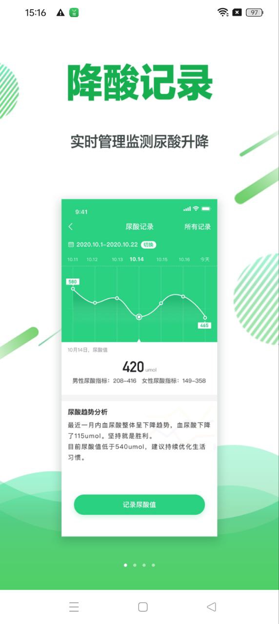 无论是医院检查还是血尿酸仪监测,都可以在这里记录尿酸。显示尿酸变化图,直观了解尿酸变化。