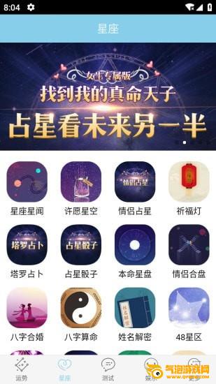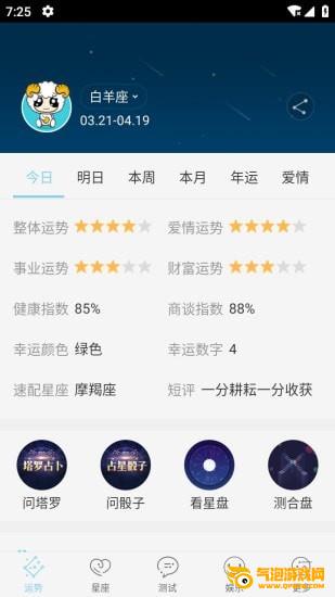 【星座控制】涵盖所有星座和评测游戏。星座星报每天都会为你提供有趣的星座信息;全方位的星座运势,包括今天的星座运势、明天的星座运势、本周的星座运势、本月的星座运势,让你随时掌握自己的星座运势。专业塔罗牌涵盖七大牌:爱情运势、工作学习、运势牌阵、理财牌阵、友谊牌阵、家庭牌阵、综合牌阵;有15个有趣的测试。