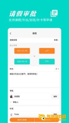 2.请假、外出、补卡、加班一键完成,审批提醒通过微信推给审批人,大大提高了审批效率。