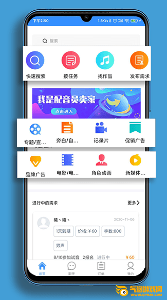 影猴配音圈app,由四川浩圣库科技有限公司开发,是一款现实生活中的配音在线交易软件,可以在这里找到专业的配音演员并与他/她交流,录制的作品可以在线交易,超级安全。