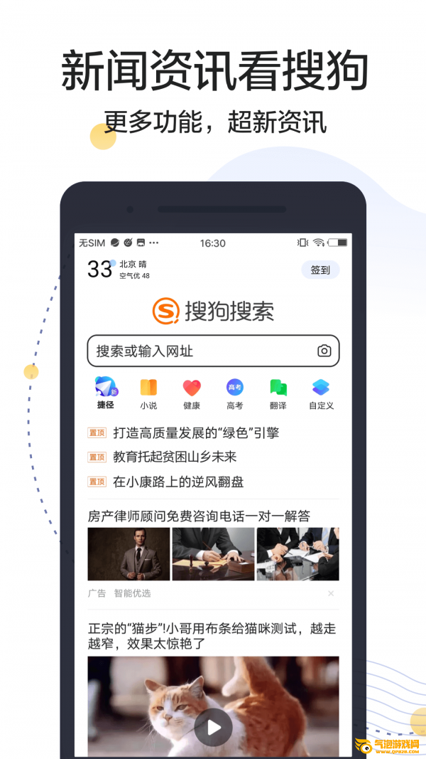 搜狗搜索app界面很简单,顶部是搜索框,下面是分类搜索,最后是便利贴,可以个性化。