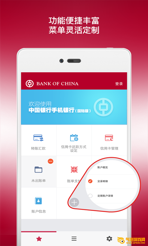 中行app是中国银行移动银行(国外版)提供的多国多语言移动金融服务,中行软件支持个人客户通过移动银行提供账户查询、转账汇款、代理支付、信用卡、自助等基本服务(具体功能视各国/地区实际情况而定)。同时,中行app依托手机银行渠道,实现境内外华人银行账户的全球管理。在设计上,中行手机版更符合手机用户的使用习惯。页面简洁明了,BOC app为您提供了轻松便捷的操作体验。