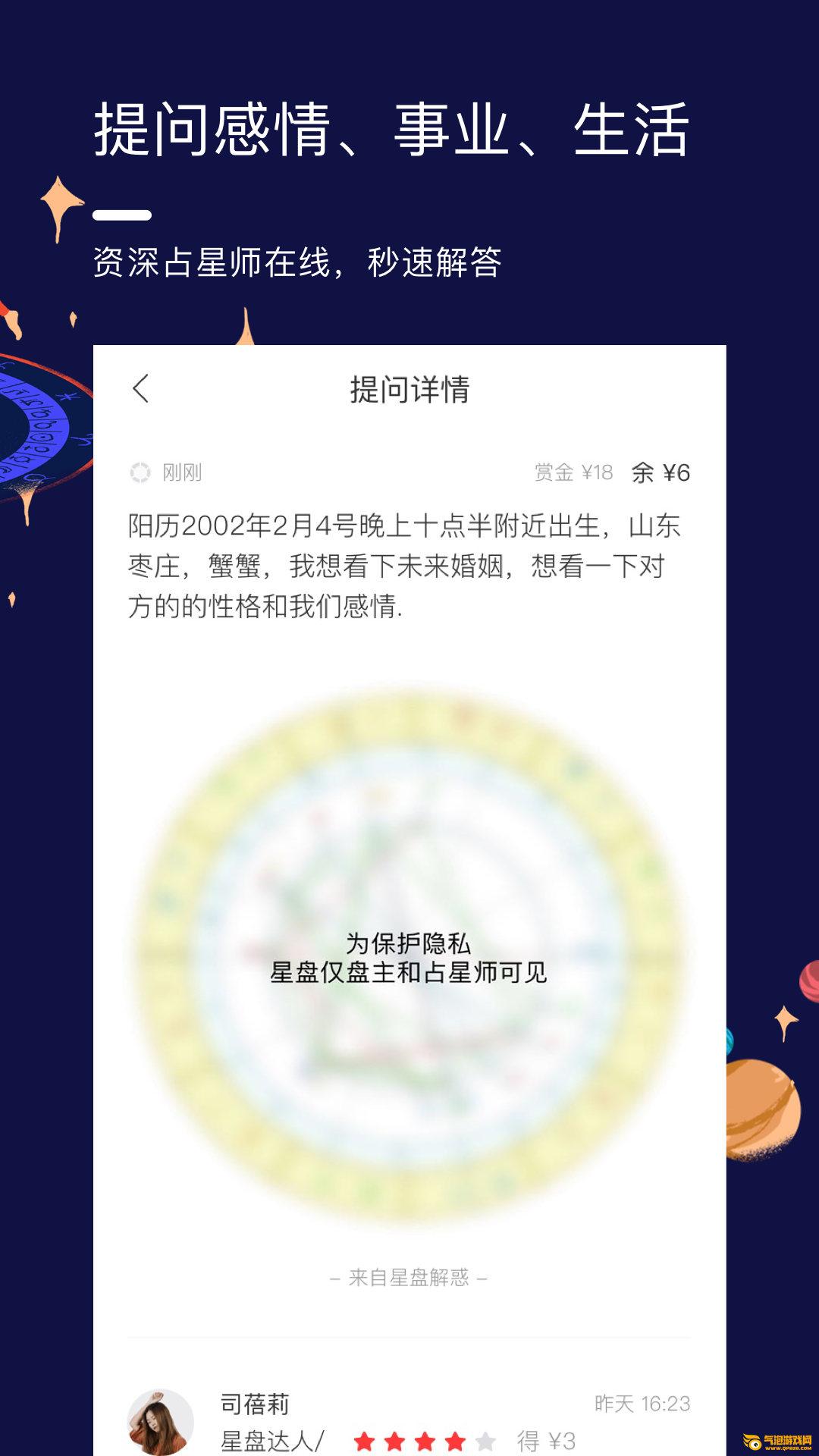 星盘说那个app是免费星盘分析的应用。星盘上说用户可以问感情、事业、生活等问题。星盘上说资深占星师可以在线回答你的问题,随时打电话咨询。