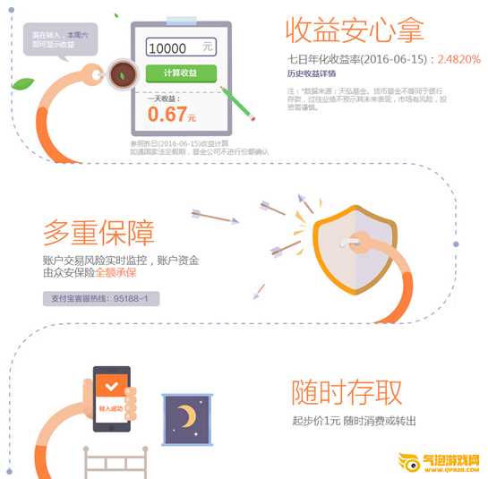 余额宝是支付宝为用户推出的资金支付和信息展示服务。向余额宝转移资金,是指从基金公司等机构购买相应的金融产品。余额宝支持田弘基金“余额宝”货币基金一期。货币基金主要用于投资安全性高、收益稳定的证券,如政府债券、银行存款等。投资者购买货币市场基金并不意味着他们将资金作为存款存入银行或接受存款的金融机构。基金公司不保证基金会盈利或最低收益。