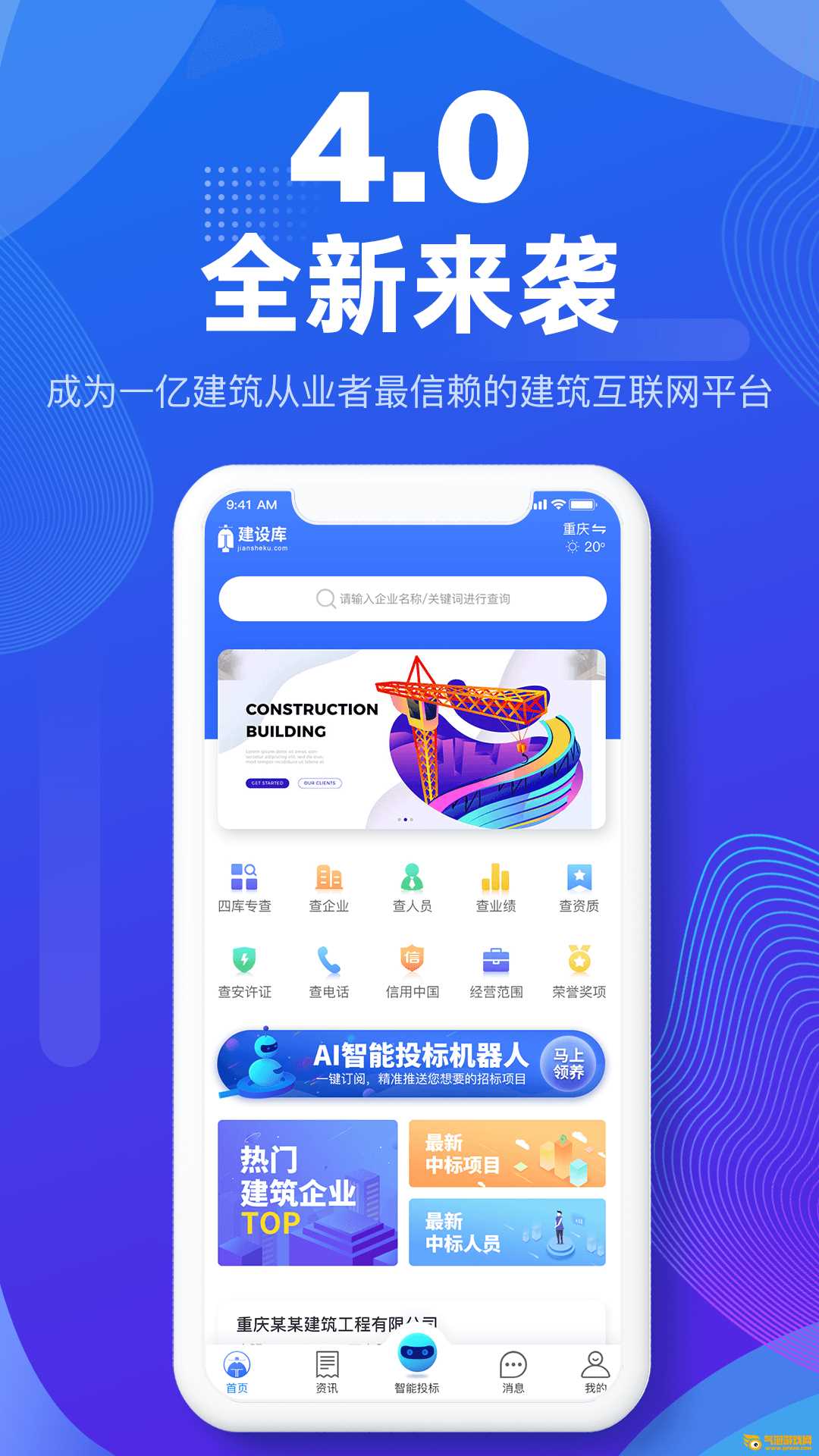 建筑库app,建筑行业招标辅助软件。在建库app中,可以快速查询企业资质信息,了解最新招标信息,一键评估施工企业风险。