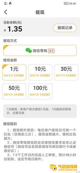 支持支付宝、微信钱包取款,话费充值。