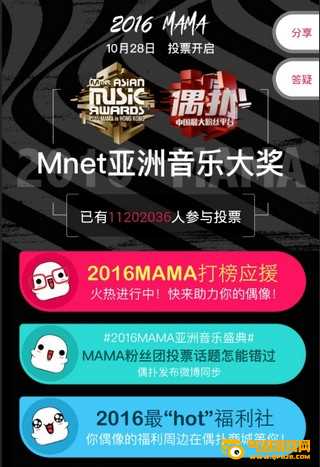 我妈投票官网2016是一个掀起热潮的明星资讯平台。在妈妈投票app上,可以了解爱豆的最新资讯和动态,提供Mnet亚洲音乐大奖投票渠道。快来为你的爱豆投票吧!