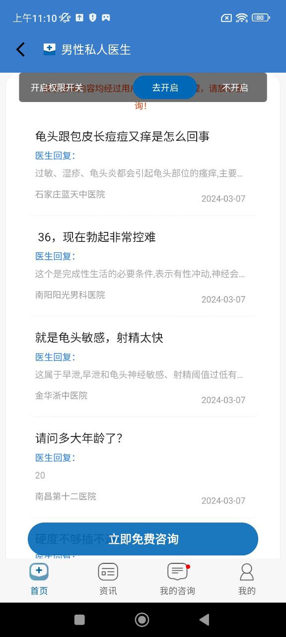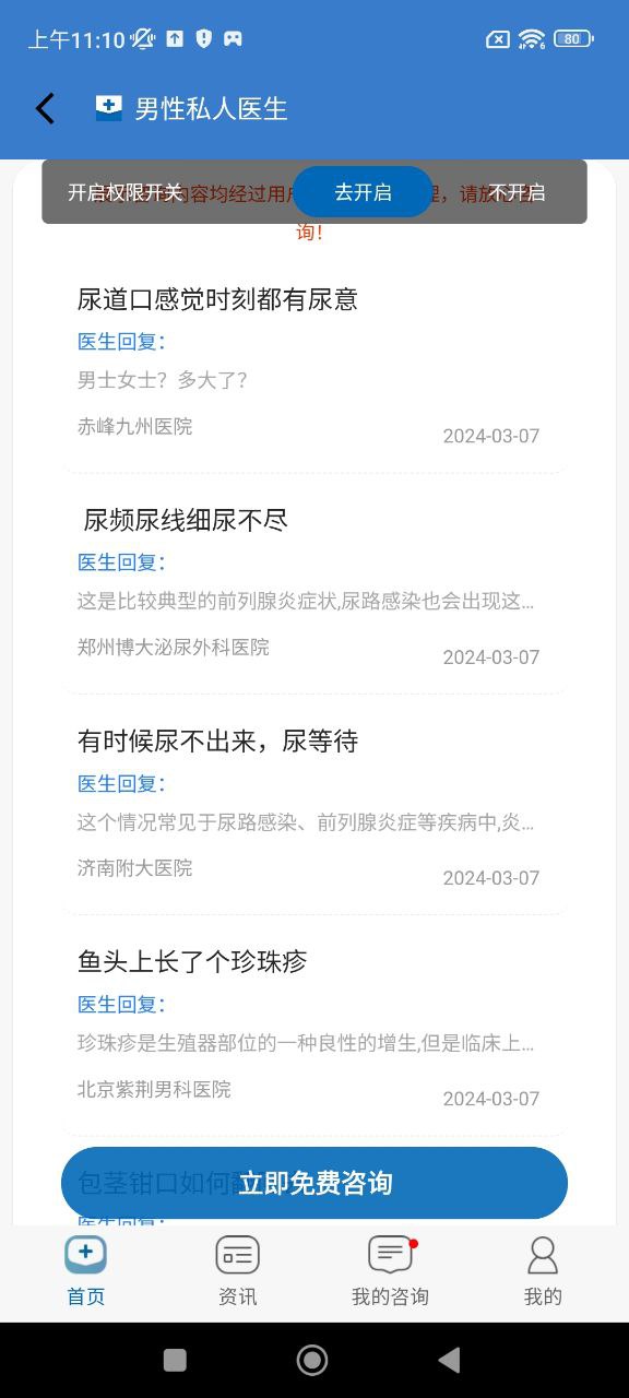 男性私人医生是一款针对男生生理健康及相关专科类病症,提供免费在线咨询的健康类服务软件。集合上千家医院的在职医生和资源,自动分配所在地就近医院医生为您提供健康指导,免去挂号难,排队久的困扰,提问流程简单便捷,让您随时随地享受VIP健康咨询服务。(建议允许定位以便能准确分配到所在地医院)。