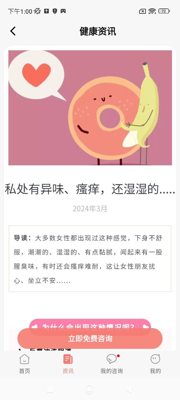 本产品专为女生用户提供免费的医疗健康咨询服务。痘痘,姨妈痛等私密尴尬病症总是难以启齿;挂号难,排队久,换来不到5句话的答复,此类问题给患者来带诸多不便。本产品集合上千家医院的多个科室,不同病症选择不同科室分类咨询;简单快捷的提问过程,让您随时随地享受VIP健康咨询服务。(建议允许定位以便能准确分配到所在地医院)。