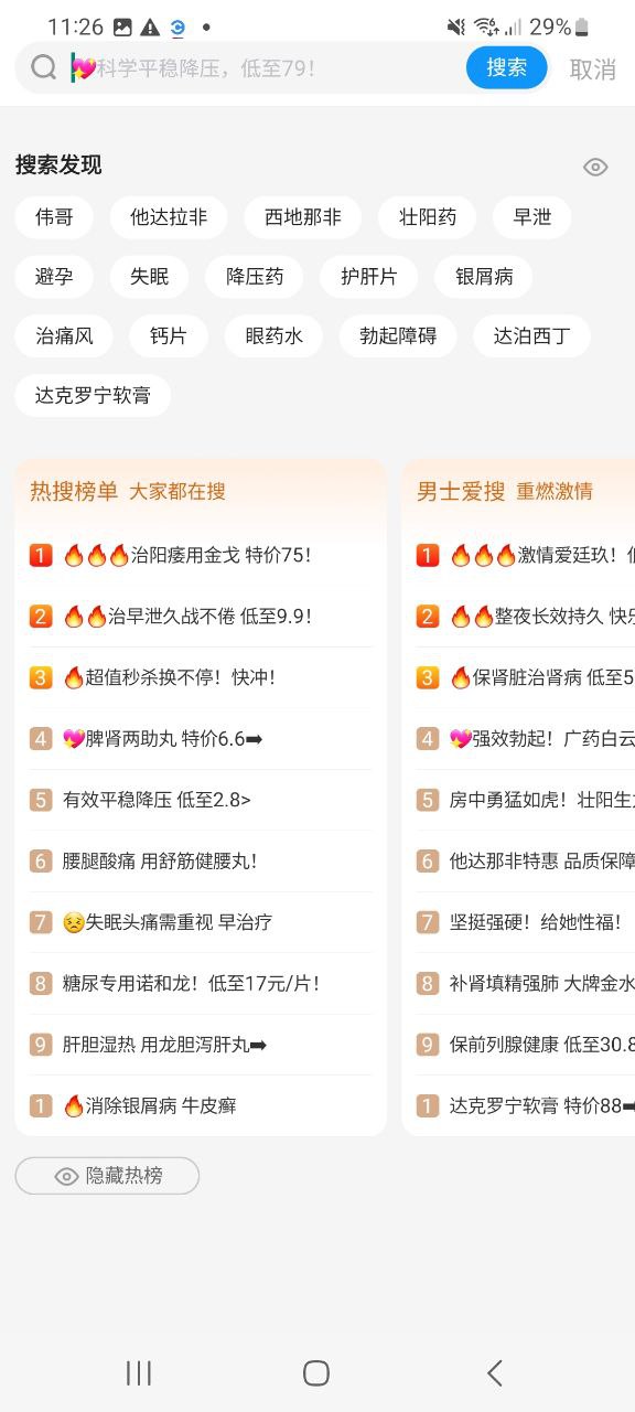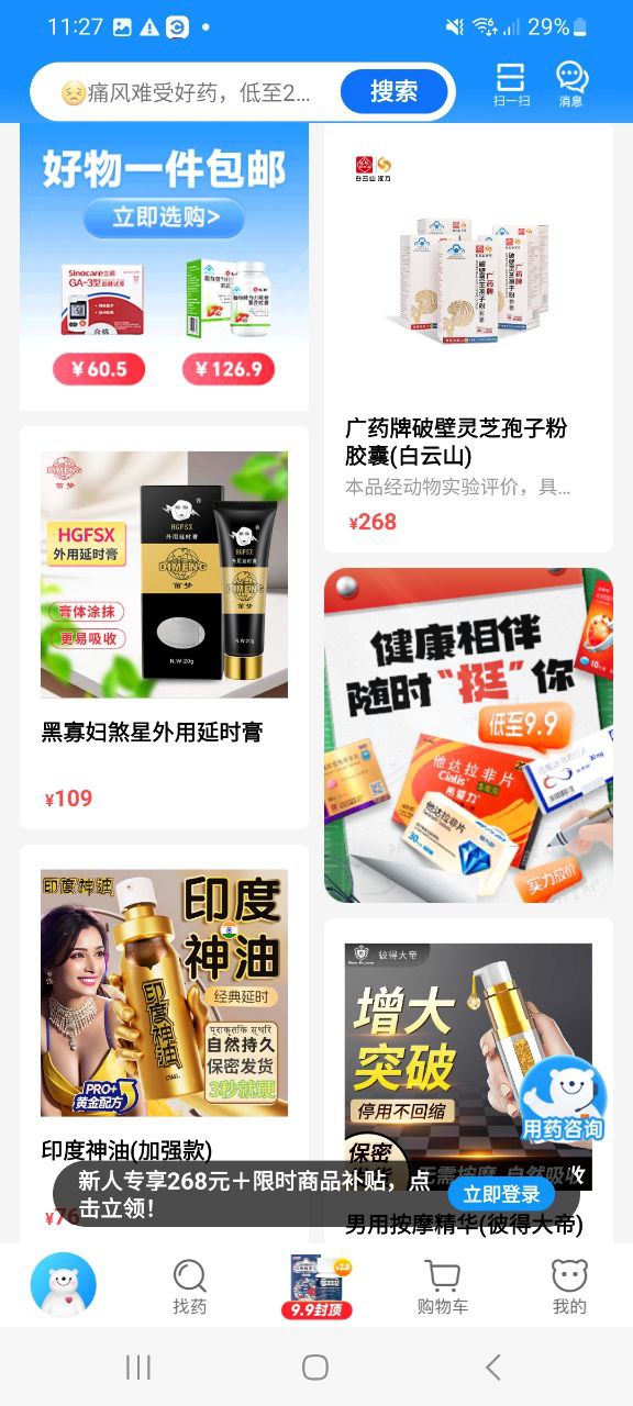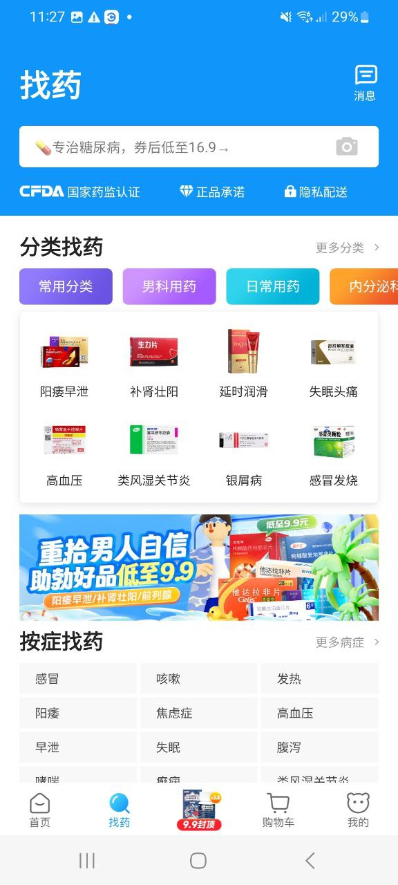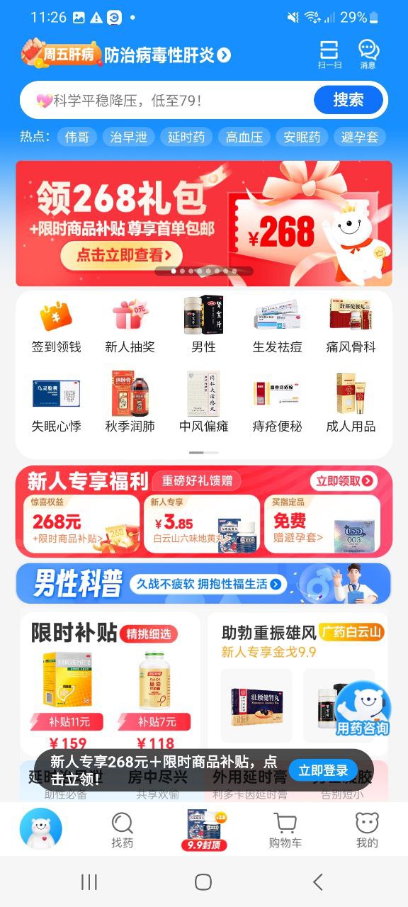 药品齐全:涵盖了海量优质上架药品,包括男性用药(强肾健体、速效壮阳等)、家中带备药(头痛压疼、肌肉关节创伤等)、保健养生(蛋白质、维生素/矿物质、美容补血等)、专科用药(肝病、肿瘤、糖尿病等)、成人用品等。药品涉及医药领域方方面面,一应俱全,让用户一站式购健康。