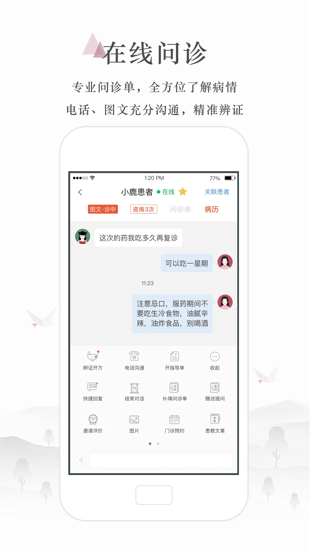 高效维护新老患者、图文语音咨询、线上复诊、开具处方、舌像AI识别、预约挂号;