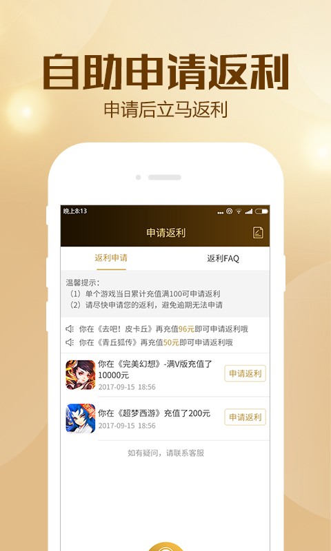 4、盒子可自助申请游戏返利,只需填写对应的账号信息,即可提交返利,简单快捷。