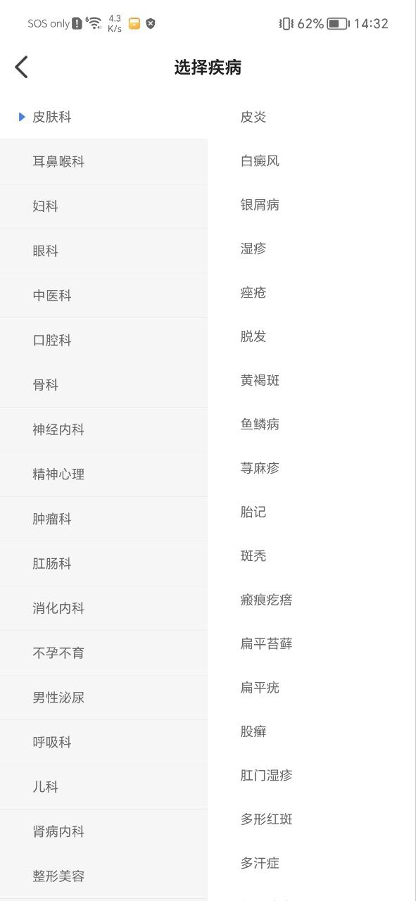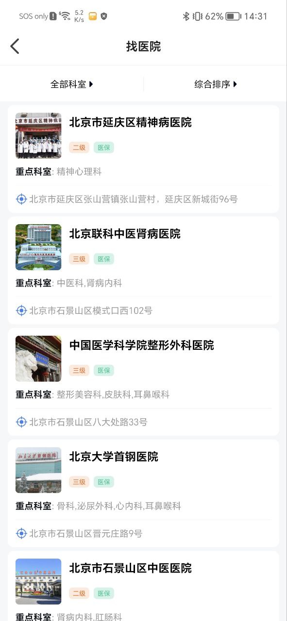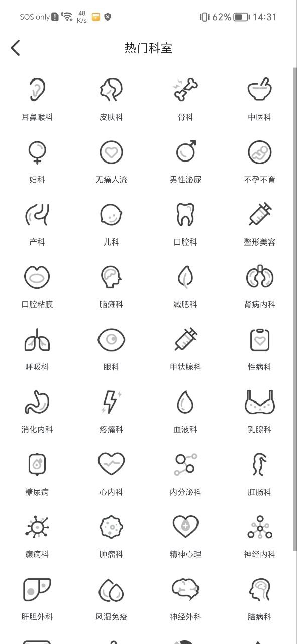 耳鼻喉头颈科,皮肤性病科,中医科,骨科,美容整形科,呼吸内科,口腔科,男科,妇科,计生科,不孕不育科,产科,儿科,肾病内科,乳腺科,减肥科,肛肠科,胃肠科,眼科,脑瘫科,癫痫科,肝病科,肿瘤科,精神心理科等.