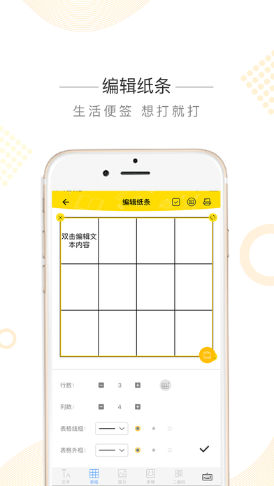 【编辑】可以自由编辑调整你想要的内容,插入文本、图片、表情、表格和二维码等,支持横版和竖版打印;