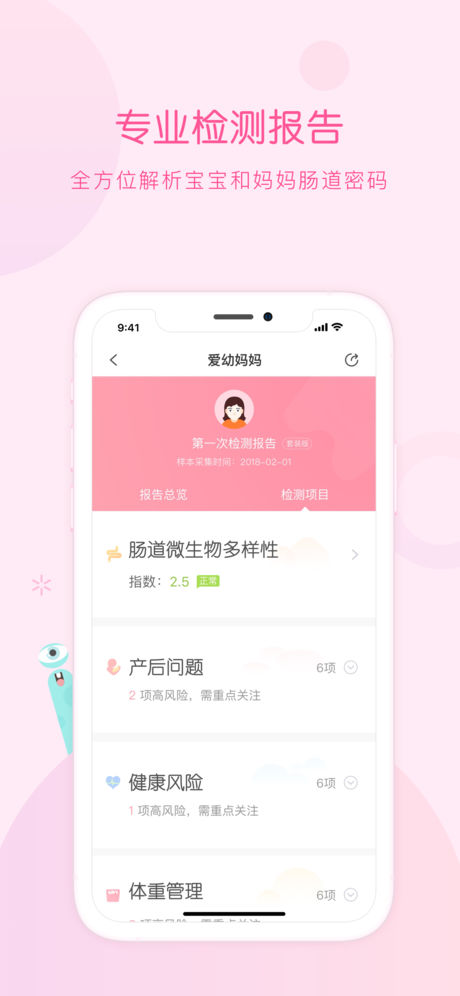 检测报告:提供产后问题、营养能力、健康状况、体重管理4大类共计46个检测项目的解读及健康建议,全方位解析宝宝和妈妈的肠道密码。