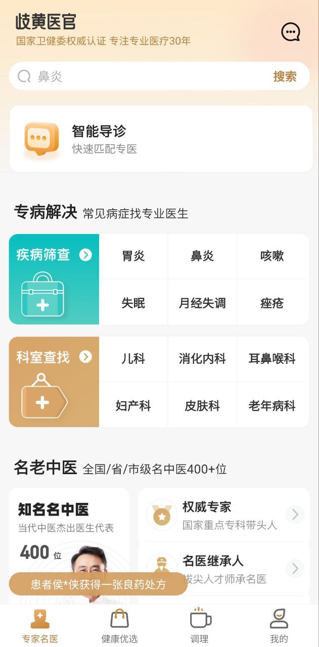 歧黄医官是一款移动互联网在线问诊医疗应用,以互联网+医疗的形式针对性解决患者的看病难、看病贵的问题。线上专注于医疗问诊服务,线下专注于药品质量。为用户提供在线诊疗、