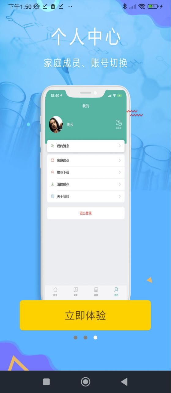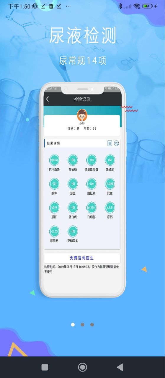2.检测中心---随时使用智能手机扫描,进行尿液14项、阴道炎六联检、便潜血、小儿腹泻等项目检测,检验记录自动保存,并可进行趋势分析,随时监测健康状态。