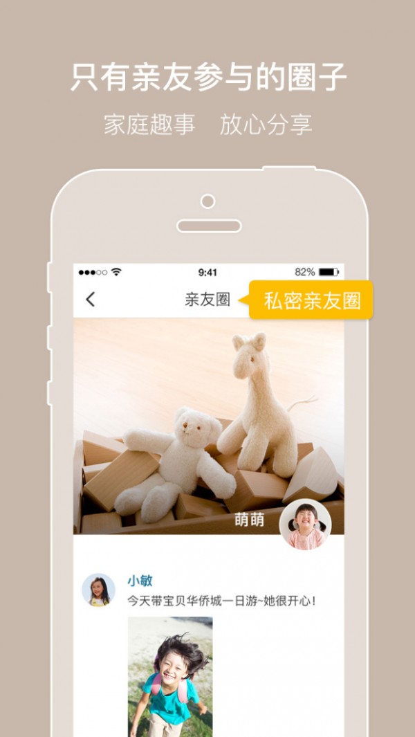 安全放心的亲友圈――邀请亲友加入亲信不仅可以互相查看、记录小孩的动态,亲友还可以组成亲友圈,在朋友圈不方便发的亲友动态全部可以发到亲友圈,让亲友距离更近。
