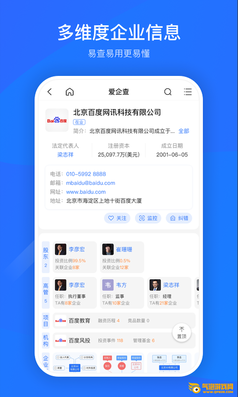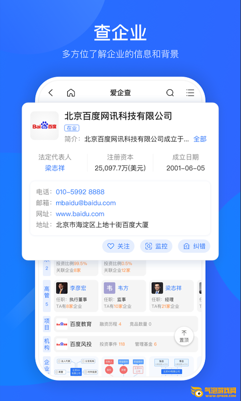 爱企查app是一款全国所有企业认证注册信息一键快速查询的手机软件,无论是查企业,还是差老板,打开爱企查app用户想要了解的所有信息这里都有,爱企查app,精选搜索,一点即达,真实又快捷。
