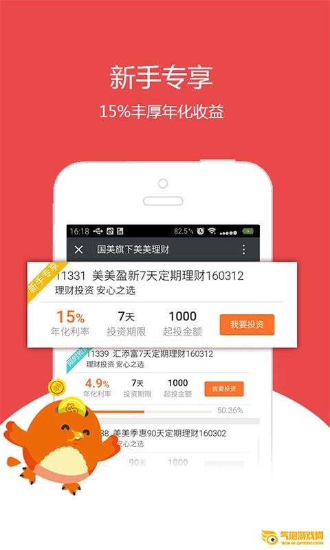 美美理财app是一款投资理财应用,美美理财app为用户提供一个安全稳定的投资平台,让用户可以自由选择合适的理财产品,体验高收益低门槛的理财服务。