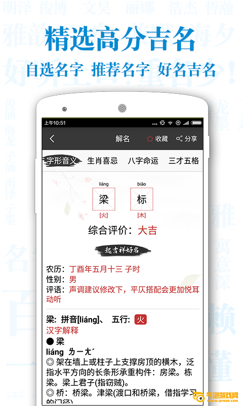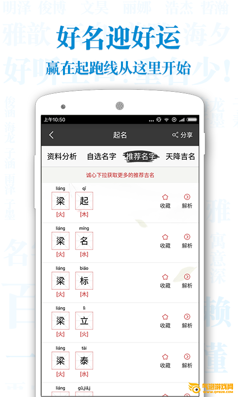 【宝宝起名】以易经五行为基础,将中国传统周易取名哲学融汇其中,为你筛选出适合自己生辰八字的好名字!千万不要小看名字的打分,说不定有的名字能够给你带来一生好福气,让你青云直上,富可敌国哦!