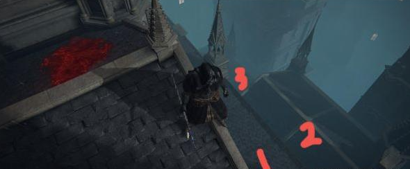 4、先跳到一号房顶再跳到二号房顶然后接着到四号,跳下来就是图三,回头往后走下面看到房顶图四。