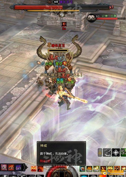2、神威状态下击杀增长天王。做法提示:建议俩人一起打普通南天门,因为神威状态下是不能释放技能的。仍然是打残血,然后近身,看BOSS身边有蓝光闪出接下来就要释放神威,这时候你无法释放技能,让你的小伙伴秒掉BOSS即可。