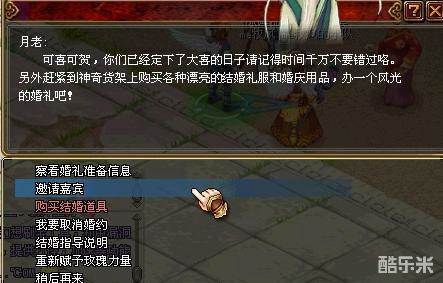 确定婚期后,可以在月老处选择婚礼地点、购买请柬;也可以在神奇货架选择迎亲方式、迎亲随从、购买结婚礼服、婚礼焰火、喜糖、请柬等等;