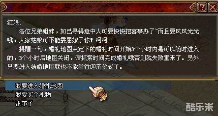 迎亲必须拥有迎亲道具,迎亲道具可以向月老购买或者从货架订购获得,如没有道具,则直接通过红娘进入礼堂;(红娘和月老在各主城都有);