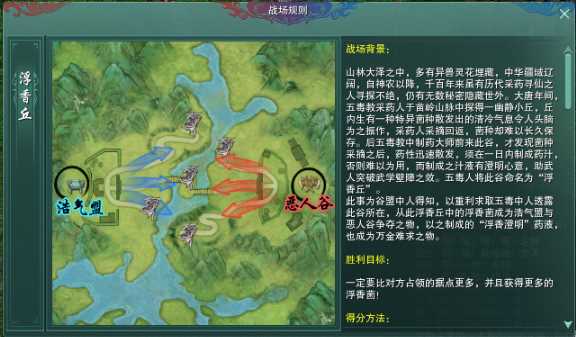 1000分制,战场时长25分钟,每方25人。可以靠占点夺旗、运送镖银、保护物资车到达获得分数,率先达到1000分或时间结束得分高的阵营获胜。