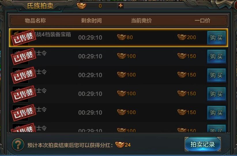 物品奖励:勇士令、英雄令、不同档次装备宝箱、装备材料、铜钱、银两、功勋等物品。氏族成员参与城战活动,有机会获得拍卖行奖励。